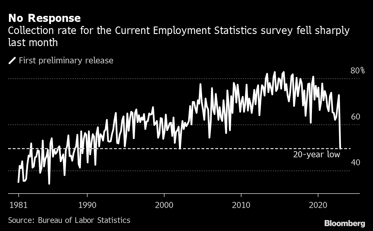“For what's it worth, BLS finds little correlation between low response rates and the absolute magnitude of revisions,” Michael Feroli, chief US economist at JPMorgan Chase & Co., said in a note.