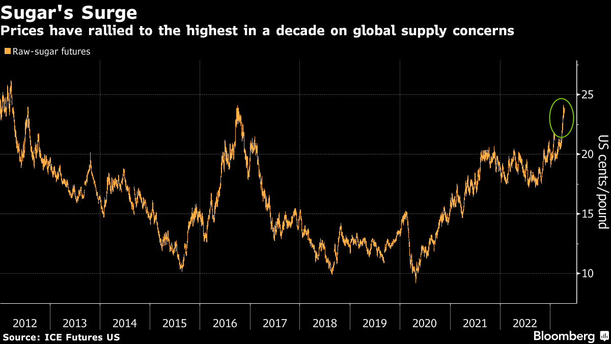 The prospect of a looming El Nino comes at a bad time for the market, with sugar surging to the highest in a decade on the back of tight global supplies. That's threatening to add to costs for manufacturers of everything from soft drinks to baked goods and maintain pressure on global food inflation.