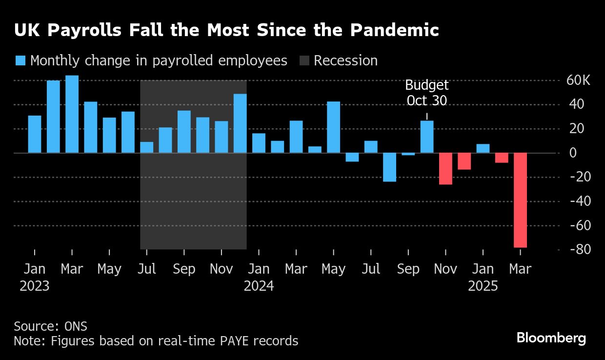 UK businesses shed workers at the fastest pace since the start of the pandemic shortly before they were hit by a £26 billion ($34.3 billion) rise in payroll taxes and US tariffs. Vacancies in the first quarter slipped below pre-pandemic levels for the first time since 2021.