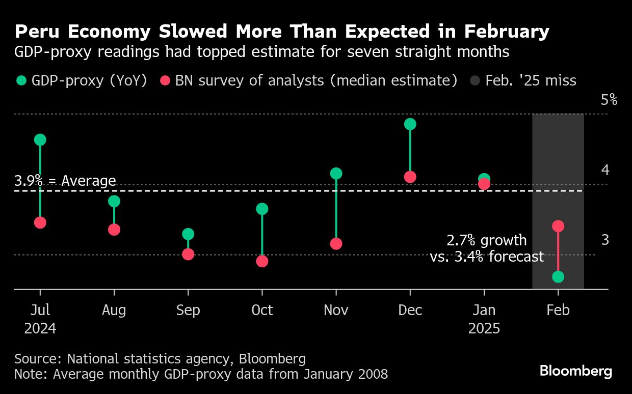 Peru's economic growth slowed more than expected in February, as the government doubles down on its target of boosting economic output to its fastest pace in seven years. Peru's government is betting that the economy can grow 4% this year, which would be the highest rate since 2018. Economists are not convinced, however.