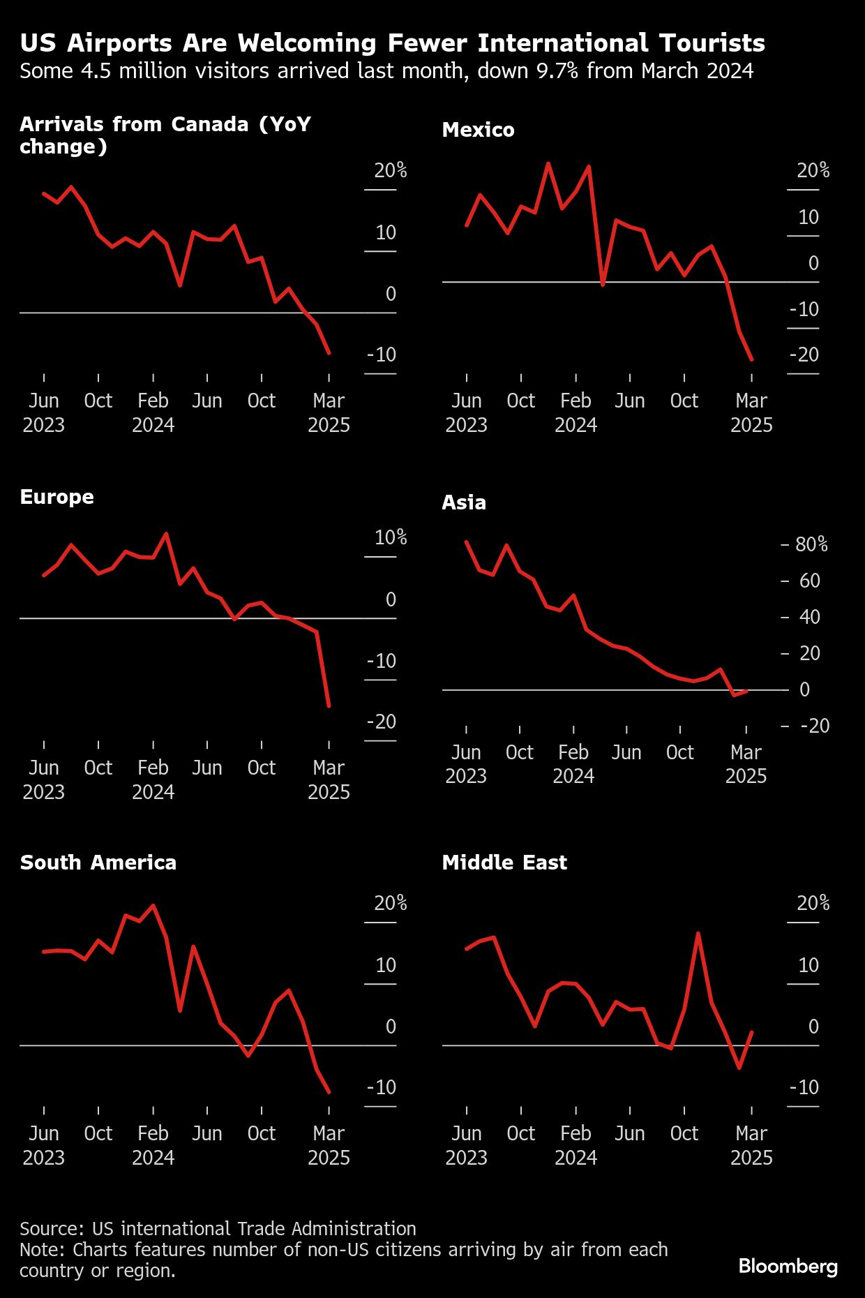 The US economy is set to lose billions of dollars in revenue in 2025 from a pullback in foreign tourism and boycotts of American products, adding to a growing list of headwinds keeping recession risk elevated.