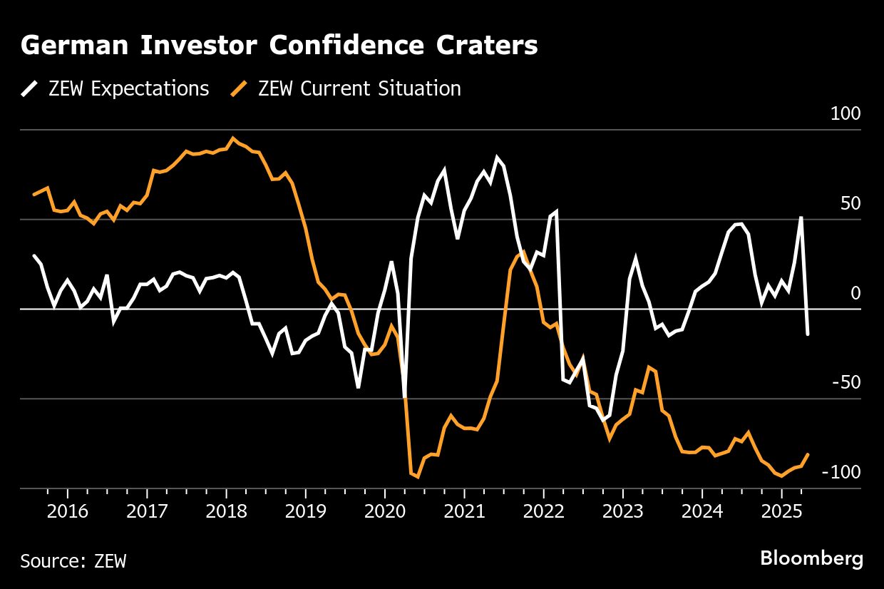 Investor confidence in Germany's economy plummeted as Trump's on-off trade measures threaten to choke off a nascent recovery. The ZEW institute's expectations index fell to minus 14 in April from 51.6 the previous month.