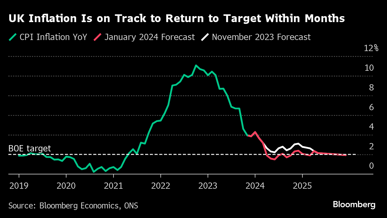 Britain's economic prospects brightened with a pickup in lending and two prominent forecasters anticipating stronger growth and rate cuts early this year. Goldman Sachs and Bloomberg Economics both upgraded their outlook for growth and predicted the Bank of England will reduce borrowing costs starting in May.