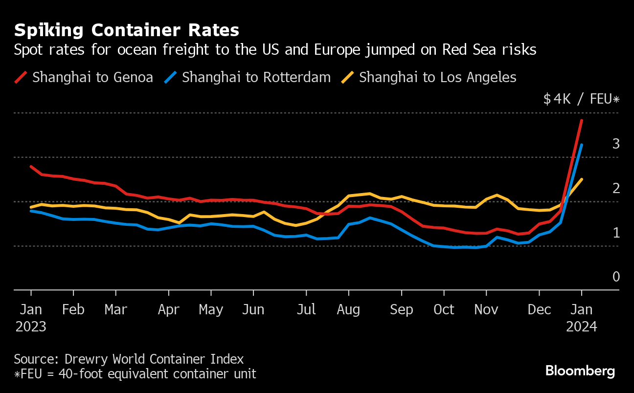 Short-term rates for container shipping between Asia, Europe and the US are climbing on reduced capacity caused by the threats to cargo vessels in the Red Sea. The spot rate for shipping goods in a 40-foot container from Asia to northern Europe now tops $4,000, a 173% jump from just before the diversions started in mid-December, Freightos.com, a cargo booking and payment platform, said late Wednesday.
