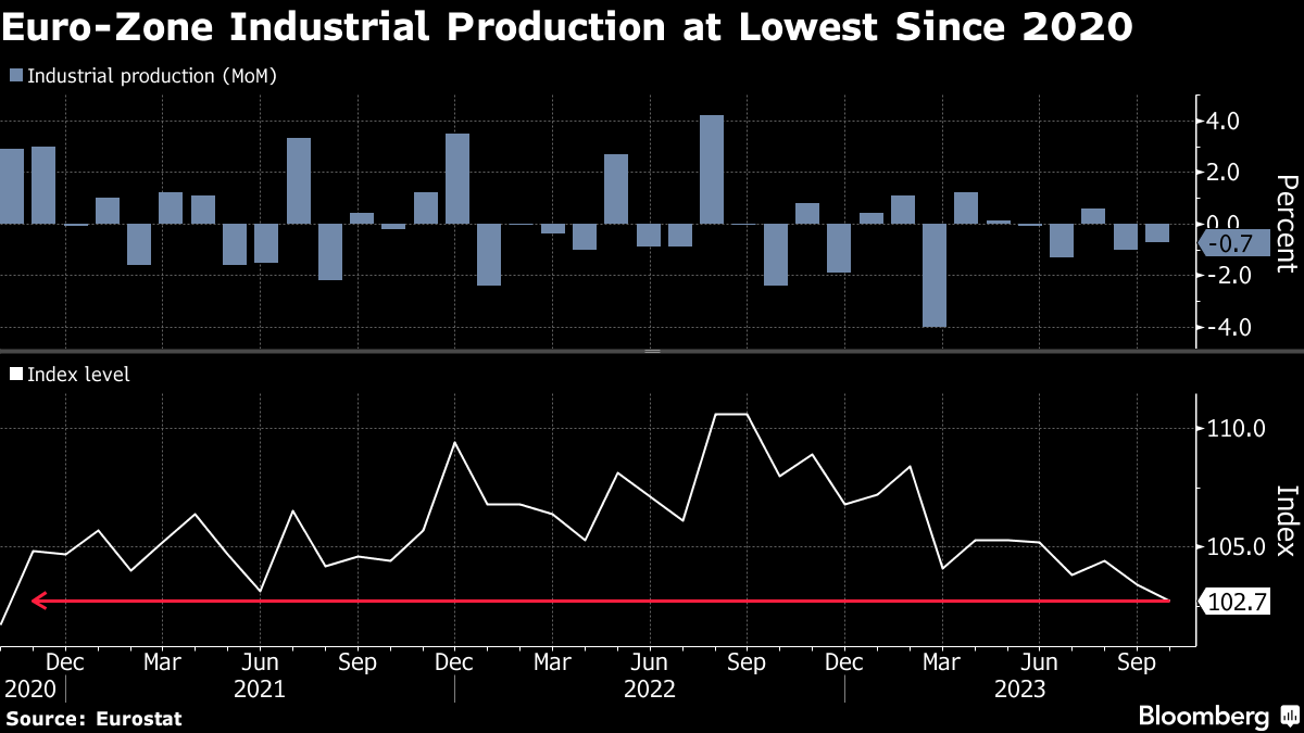 The euro zone suffered a bigger-than-expected drop in industrial production in October, a sign of weakness that could mean the economy is in a recession. Such a drop at the start of the final three-month period of 2023 means that manufacturing and the rest of the economy have more ground to cover to avoid two consecutive quarters of contraction that would amount to a downturn.