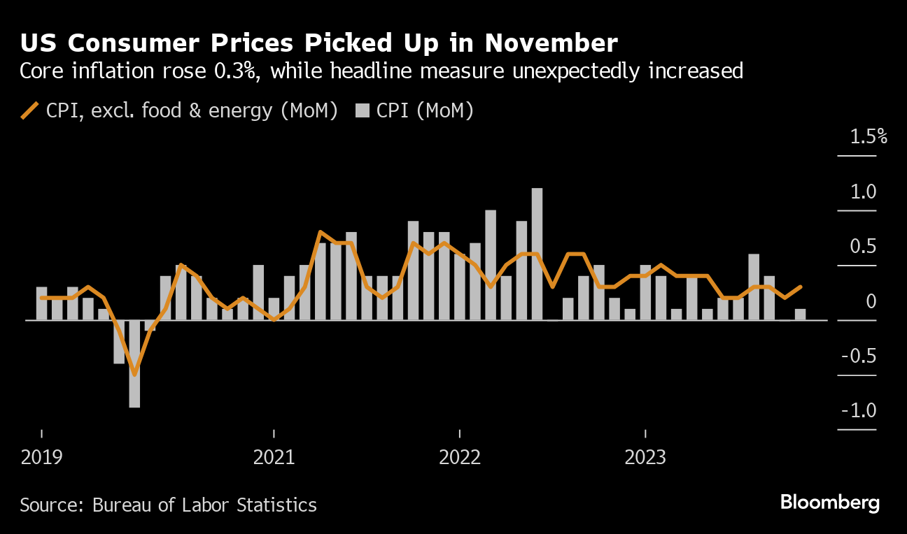 US consumer prices picked up in November on increases in housing and other service-sector costs, keeping inflation stubborn enough to thwart any Federal Reserve interest-rate cuts soon.