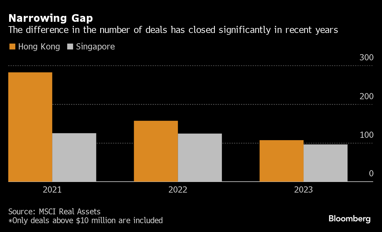Singapore is closing in on Hong Kong's lead in real estate deals as the city-state benefits from its status as a wealth haven, while distressed property sales afflict the rival Asian financial hub.