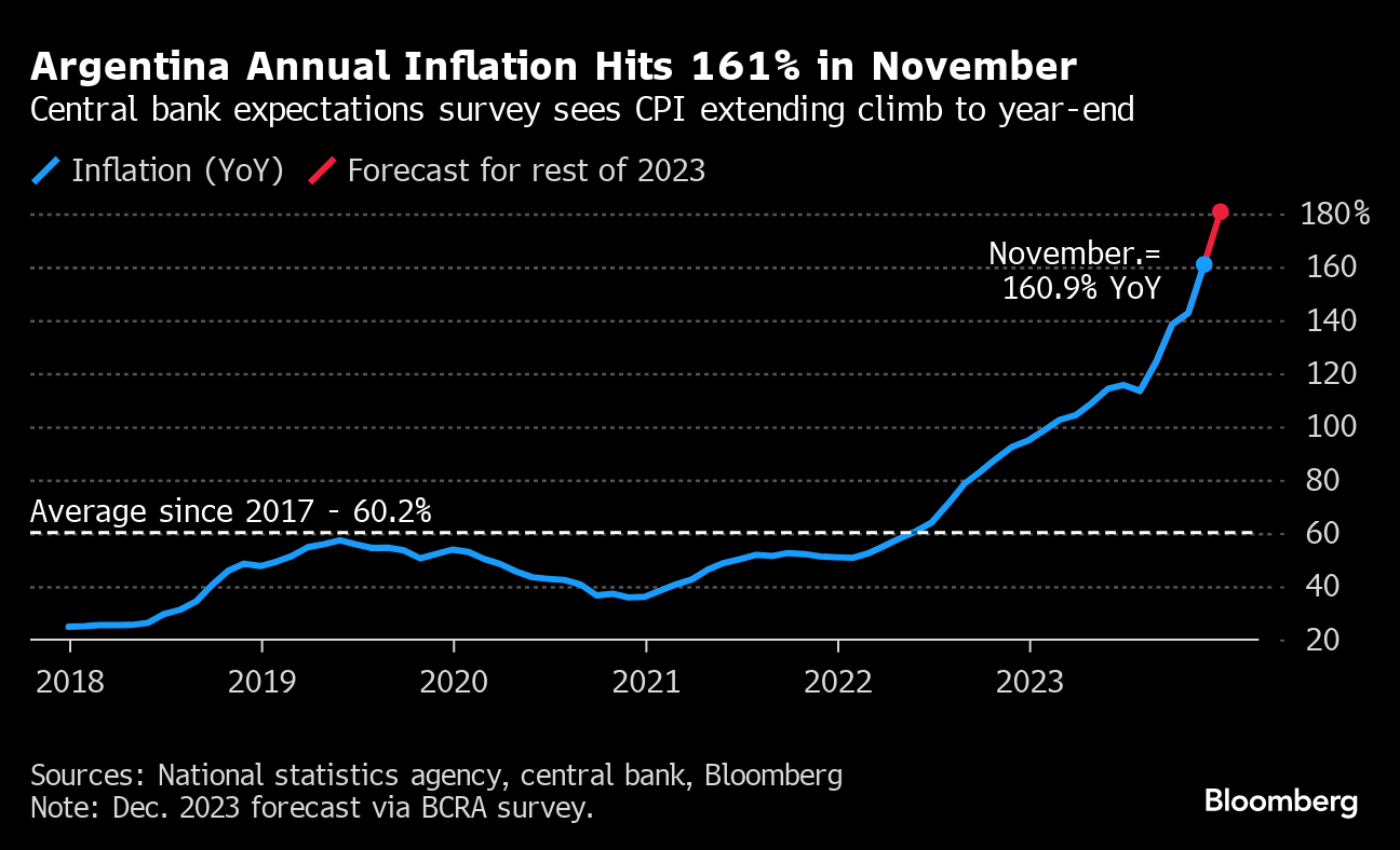 Argentina's inflation soared above 160% in November ahead of President Javier Milei's massive currency devaluation that's likely to accelerate price increases ever further this month. The first days of December have already seen price increases of 15% compared with a month earlier, and may end the month up around 20%, according to consulting firm C&T Asesores.