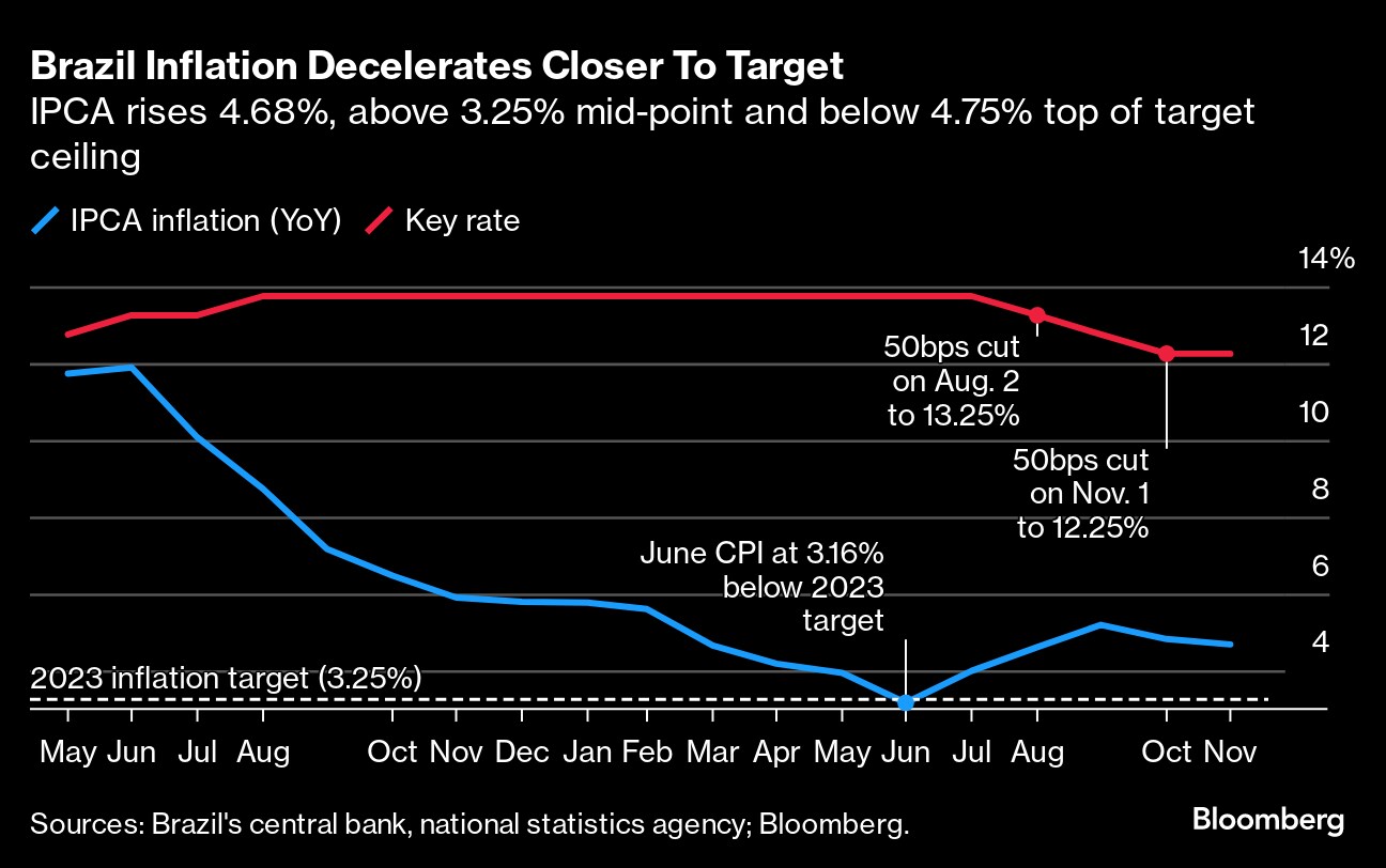 Brazil's annual inflation rate fell to within the central bank's target range, preceding a fourth-straight cut to borrowing costs by policymakers. The country's central bankers are forging ahead with plans to ease monetary policy with “serenity” and “moderation” as annual inflation is seen ending the year within the target range for the first time since 2020.