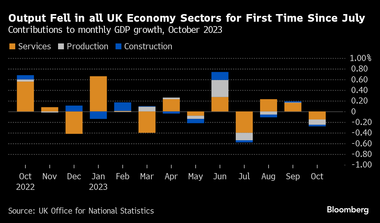 The UK economy shrank more than expected in October as elevated borrowing costs and wet weather took their toll, setting the stage for another quarter of stagnation that is widely forecast to persist through 2024. With the full impact of Bank of England interest-rate increases yet to be felt, the economy is forecast to eke out a small gain at best in the fourth quarter, with some even predicting the start of a shallow recession.