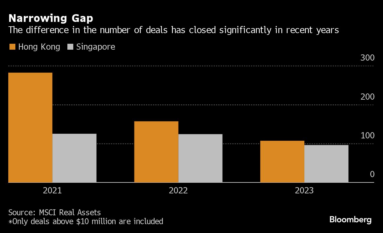 Singapore is closing in on Hong Kong's lead in real estate deals as the city-state benefits from its status as a wealth haven, while distressed property sales afflict the rival Asian financial hub.
