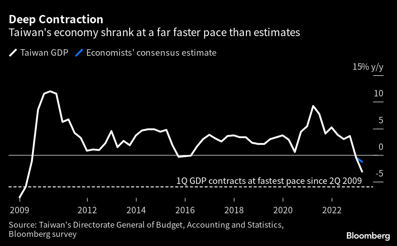 Taiwan's economy plunged into recession after shrinking at the fastest pace since the global financial crisis, a sign of how the dropoff in global demand for chips has showed little sign of abating. The 3.02% fall — the sharpest since the quarter ended June 2009 — was far worse than estimated, underscoring the difficult outlook for the trade-dependent economy as it grapples with wavering global demand for its products.