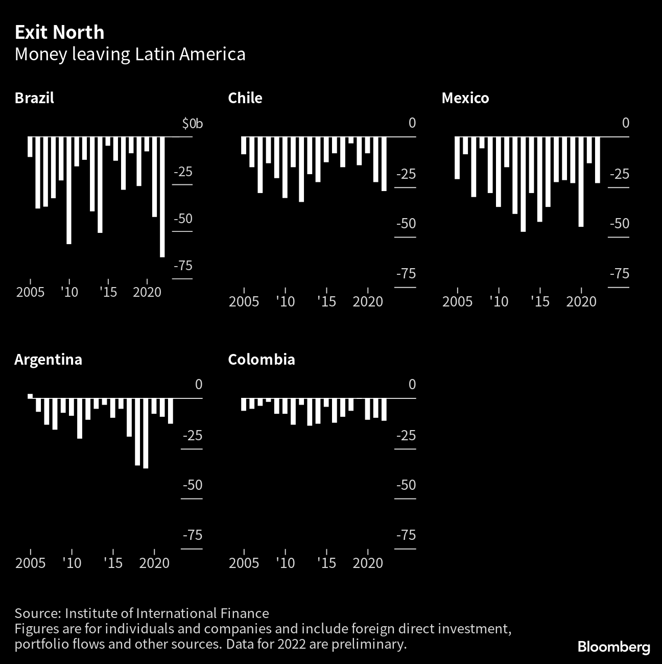 As every major country in Latin America shifts to the left in reaction to widening inequality, capital is flying out of the region. People and corporations in the region's five largest economies pulled roughly $137 billion out of their countries in 2022. That number — preliminary data from the Institute of International Finance, a group of banking institutions — is 41% higher than the 2021 figure and the most since 2010.