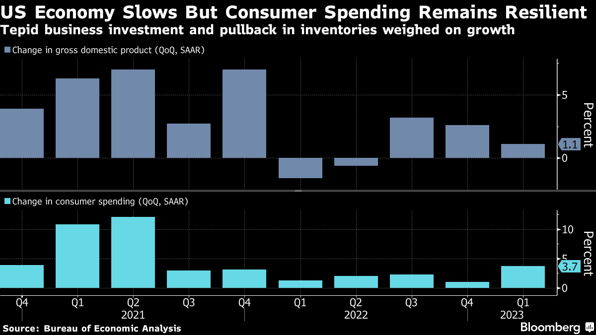Economic growth slowed in the first quarter by more than expected as tepid business investment and a pullback in inventories tempered a pickup in consumer spending.