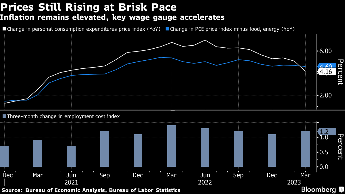 The personal consumption expenditures price index excluding food and energy, the Fed's preferred measure of underlying inflation, rose 0.3% in March from the prior month and 4.6% from a year earlier. Meanwhile, a separate report on employment costs climbed by more than forecast at the start of the year.