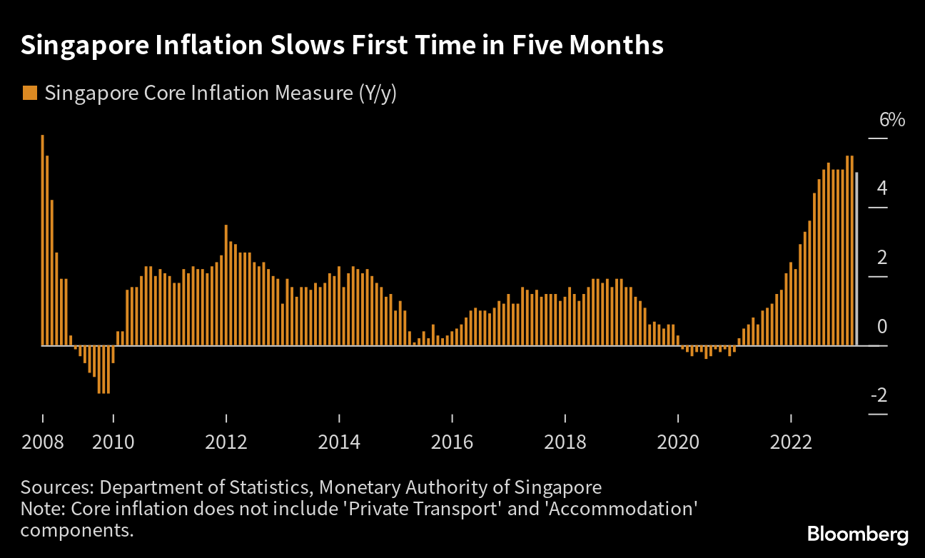 Singapore's core inflation, a key gauge tracked by the central bank, slowed for the first time since October, in a reprieve for policymakers after they paused monetary tightening to support the economy.