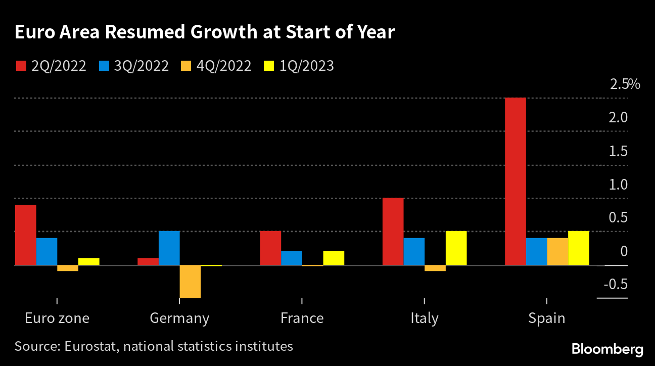 The euro zone dodged a winter recession by growing at the start of 2023, despite inflation remaining a menace. The figures will fuel the debate over how big an interest-rate hike the European Central Bank will opt for next.