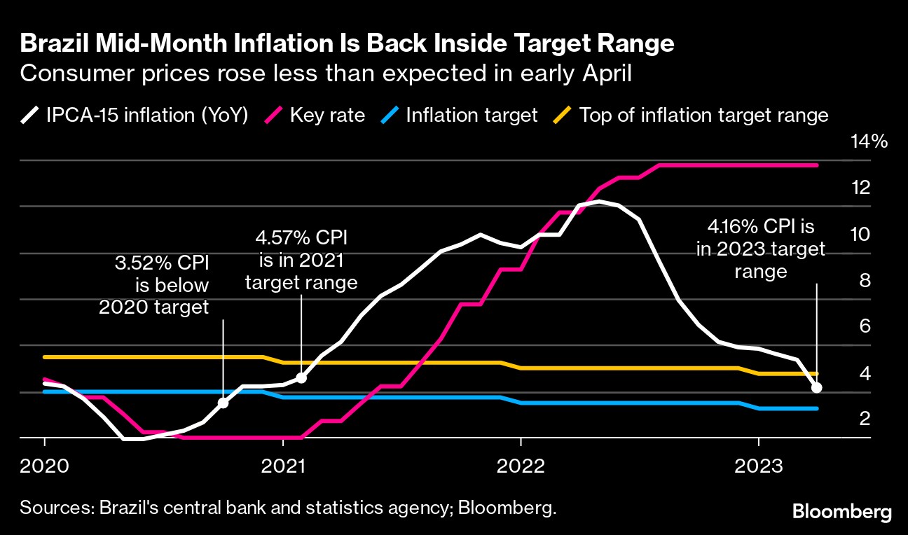 Brazil's annual inflation decelerated in early April to the lowest pace since the pandemic tore through the nation in 2020, intensifying pressure on the central bank to relax monetary policy to stimulate the economy. President Luiz Inacio Lula da Silva has responded to the slowdown by demanding the central bank lower interest rates to prevent Brazil from falling into recession and causing consumers further pain.