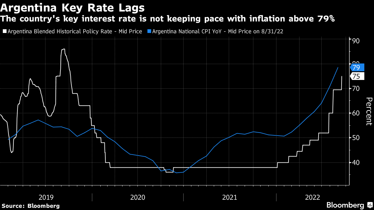 Argentina's central bank raised its benchmark interest rate for the ninth time this year to 75% in a bid to shore up its currency and curb inflation nearing 100%. Central bankers made incremental rate increases early in the year but over the past three months they have ramped up hikes, with a combined 23 percentage point increase since July.