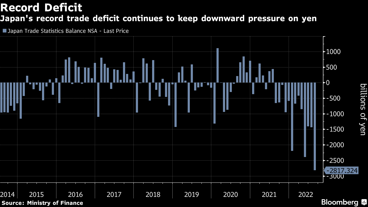 Japan's trade deficit ballooned to a record in August that highlights the increasing pain of the weak yen as import costs spiral upwards, adding to pressure on the country's economic recovery.