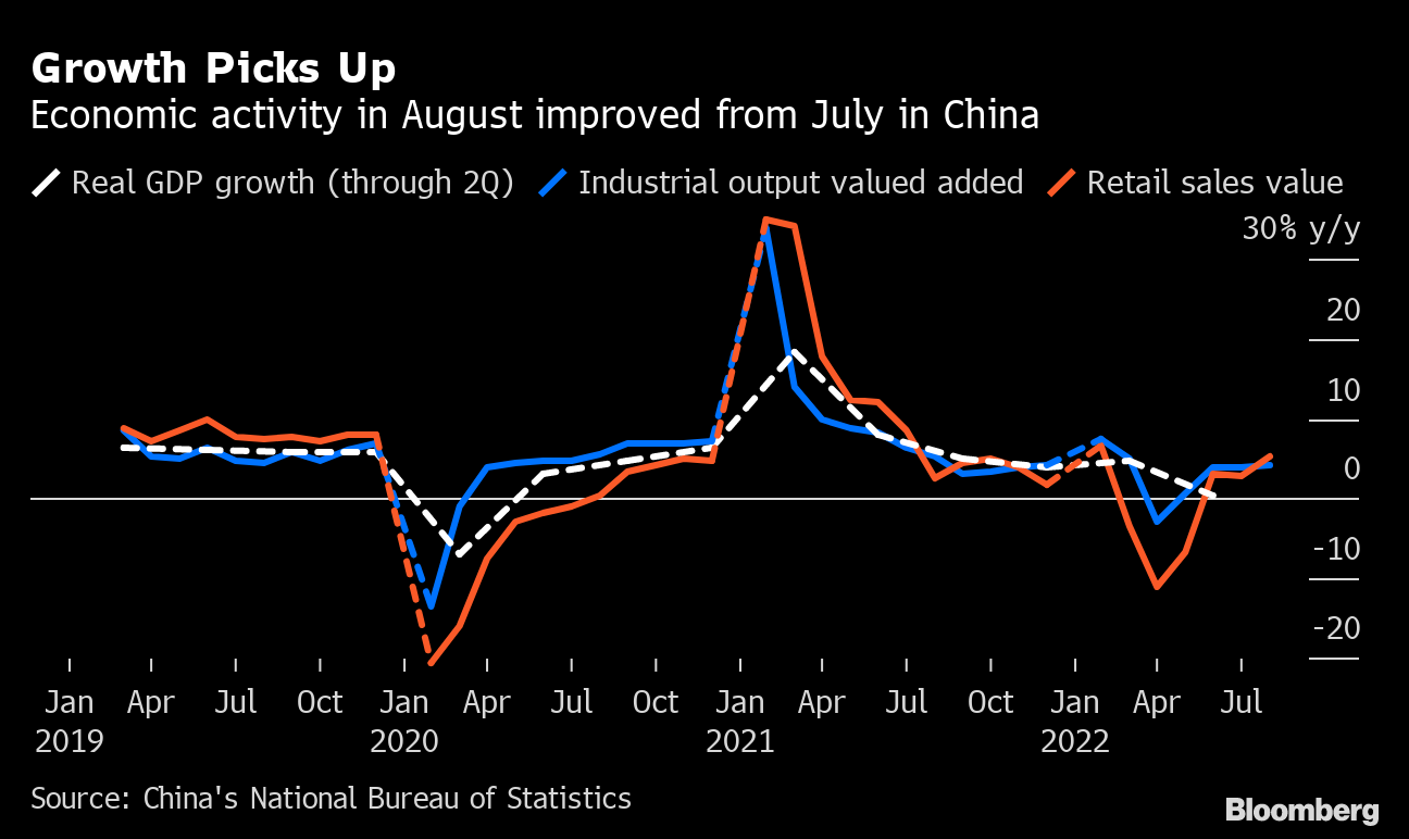 China's economy showed signs of recovery in August as Beijing rolled out stimulus measures to counter a slowdown, although a property market slump and Covid outbreaks continue to weigh on the outlook. Industrial production, retail sales and fixed-asset investment all grew more last month than economists expected.