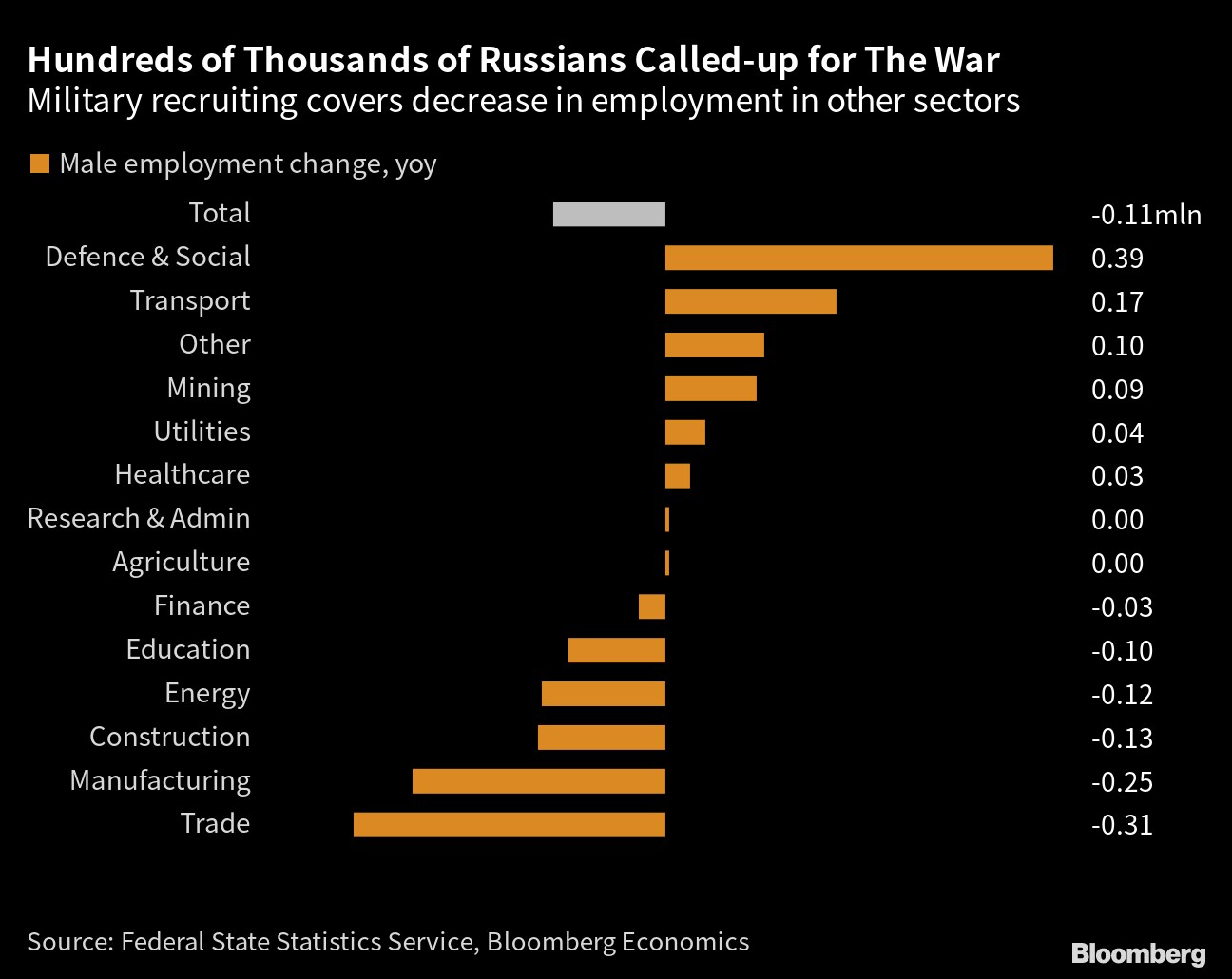 President Vladimir Putin's drive to expand Russia's armed forces is adding to labor shortages as his war in Ukraine draws hundreds of thousands of workers into the military from other sectors of the economy. The total number taken into service is likely to have exceeded half a million, according to Bloomberg's Russia economist Alexander Isakov.