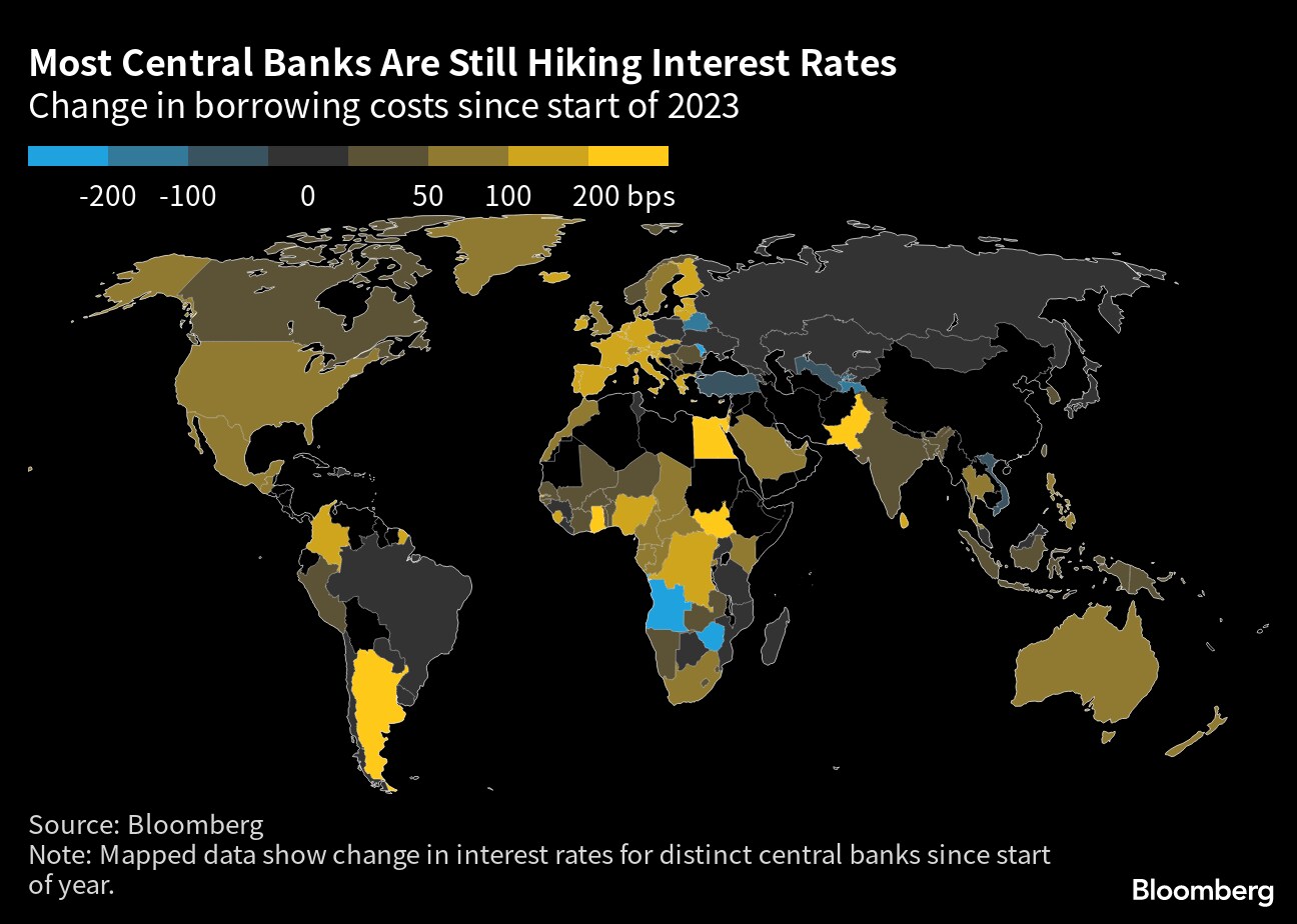 South Africa and Ghana each lifted rates by more than expected, and Thailand signaled more tightening is on the horizon. Mexico slowed its pace of hikes while Hungary's resisted government pressure to start monetary easing. Colombia increased rates to a 24-year high and Egypt went ahead with a jumbo hike.