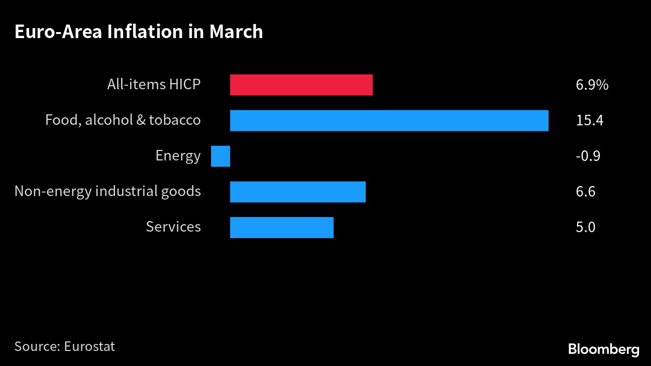 Underlying inflation in the euro area hit a fresh high, handing ammunition to ECB officials who say interest-rate increases aren't over yet. The rise to 5.7% in March's core price reading, which strips out volatile items like fuel and food costs, came alongside a record plunge in headline inflation to 6.9% from 8.5% in February.