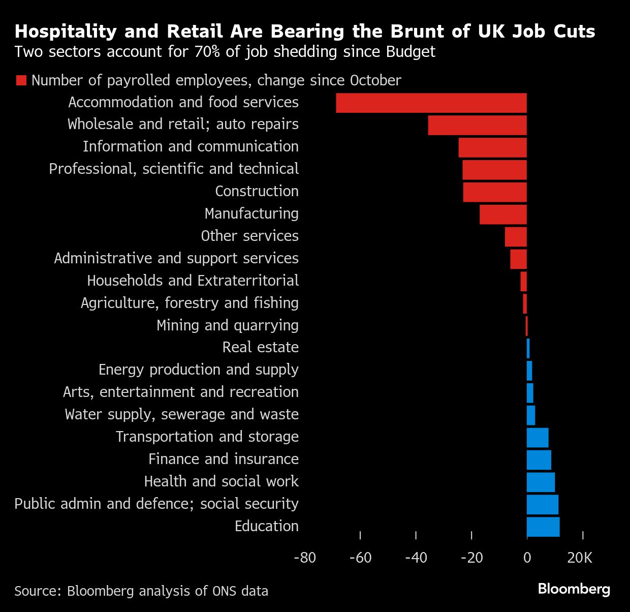 British businesses cut jobs for a third straight month in April as a £26 billion ($34 billion) tax hike took effect and US tariffs darkened the global economic outlook. The number of workers on payrolls dropped 32,532 to 30.3 million. Job vacancies fell the most in over a year in a sign of weakening demand for workers.