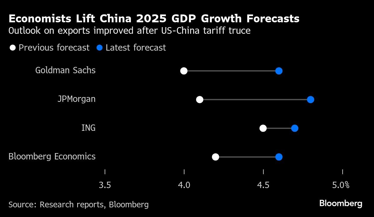 Goldman Sachs Group Inc. and other major banks boosted their forecasts for China's 2025 economic growth, citing a better outlook for exports following the tariff truce with the US.