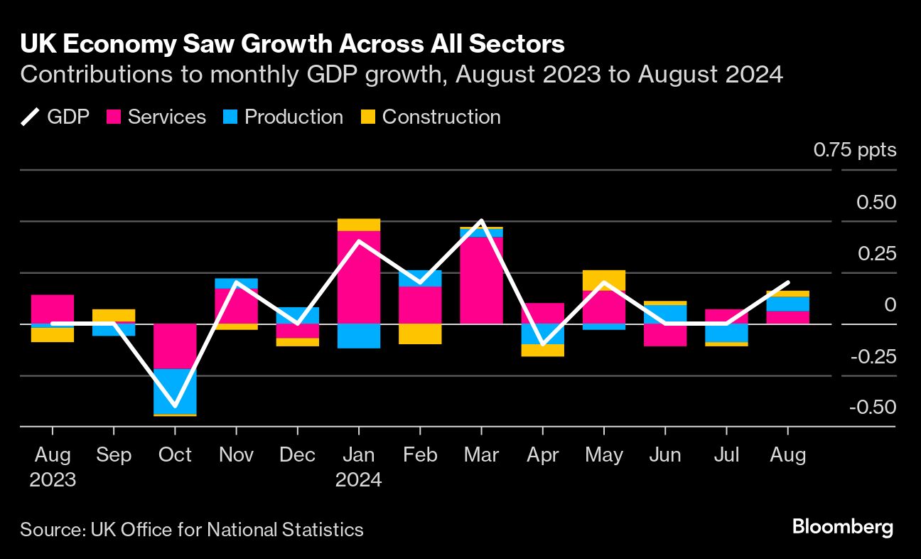 The UK economy returned to growth in August, putting Prime Minister Keir Starmer on track for a modest recovery before worries about his first budget began to weigh on sentiment. Services, production and construction all expanded on the month.