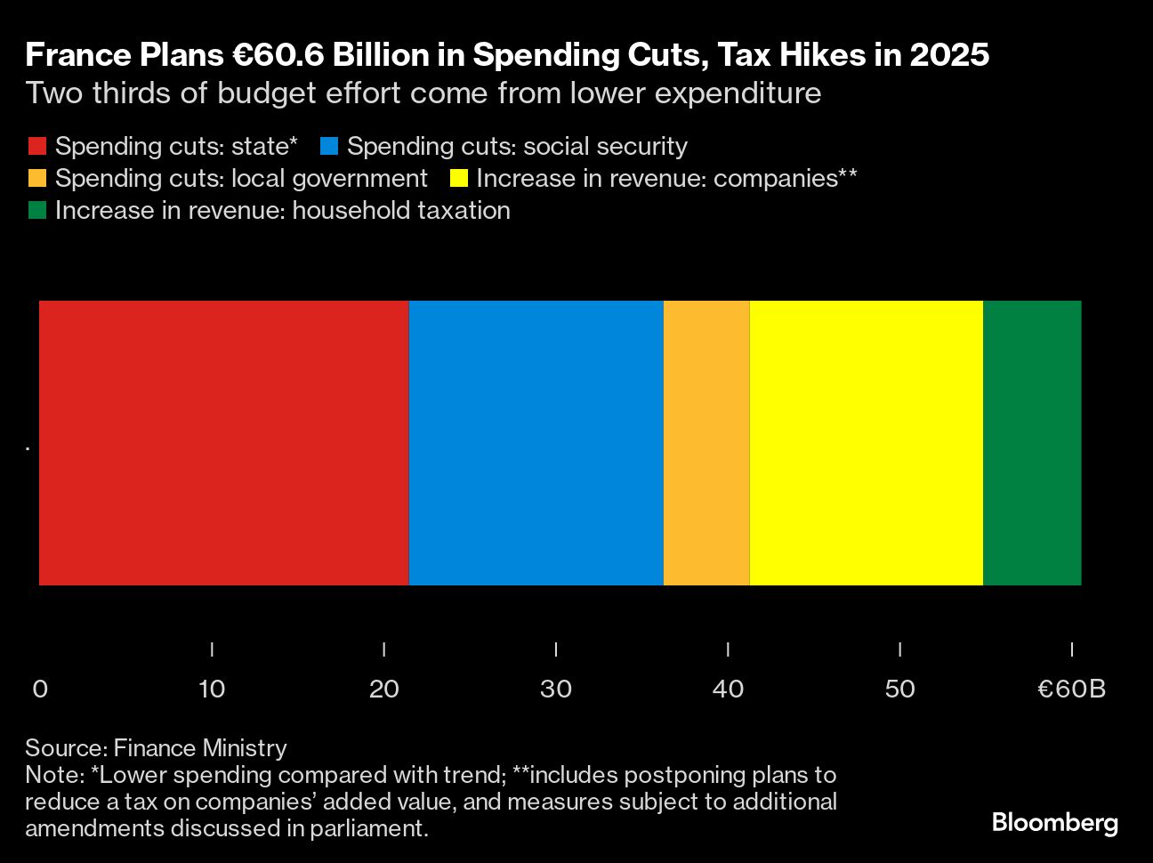 The French government unveiled a budget for next year that aims to deliver a €60.6 billion ($66.2 billion) remedy for its creaking public finances and rebuild investor confidence even as it risks eviction by a hostile parliament. Spending cuts will account for just over two thirds of what Finance Minister Antoine Armand called an unheard-of fiscal effort, with the rest coming from higher taxes on businesses, the wealthy and energy.