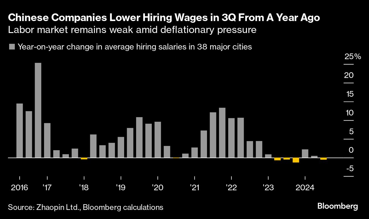 Wages offered to new hires in China declined after two straight quarters of gains, in a sign of a weakening labor market that's exacerbating persisting deflation and weighing on economic growth. Expectations are now building that the government will introduce more help in the form of public spending, which could offer subsidies to households and boost consumption.