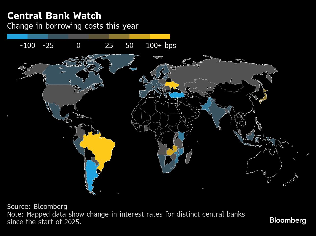 Zambia raised rates to a more than eight-year high, while Uruguay's central bank also hiked. Philippines, Peru, Serbia and Romania left borrowing costs unchanged. The Bank of Russia kept rates at a record high, while Namibia cut.