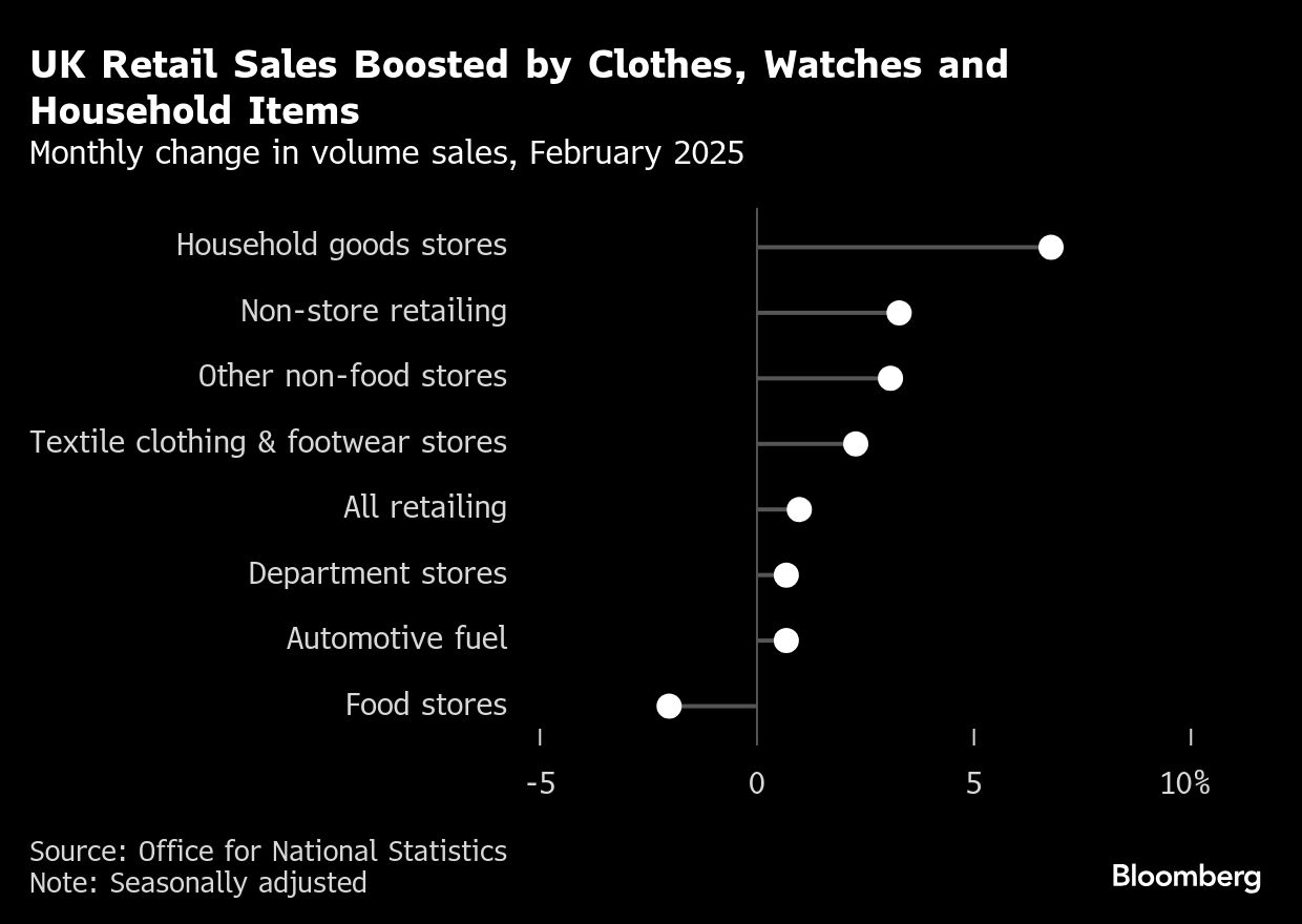 UK retail sales have risen strongly since the start of 2025 in a sign that households are beginning to spend the pot of savings they built up last year. Sales of household goods climbing almost 7%, the largest increase since April 2021. Jewelery, watches and clothes also saw a bounceback in demand.