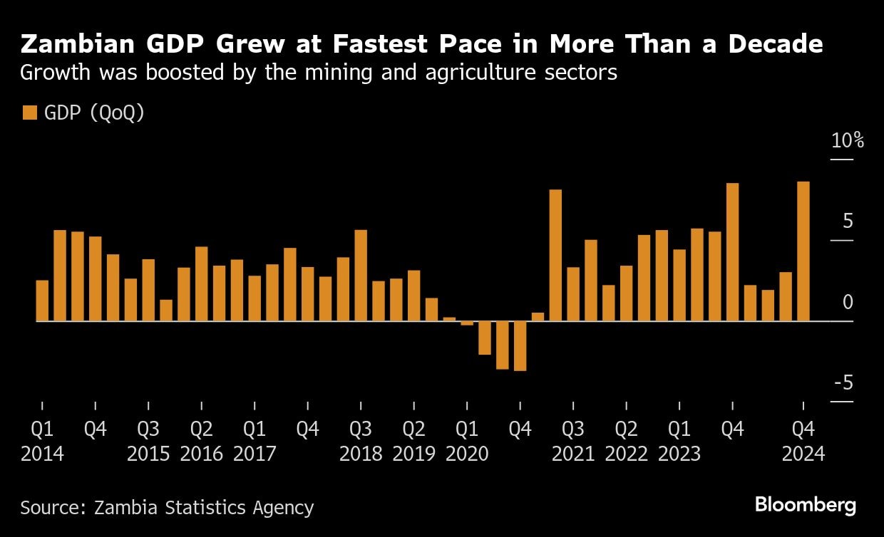 Zambia's economy grew more than expected last year, eclipsing estimates by the government and the International Monetary Fund. Output was buoyed by a rebound in the farming sector, as the southern African nation recovered from its worst drought in more than a century, and a strong performance by the mining industry.