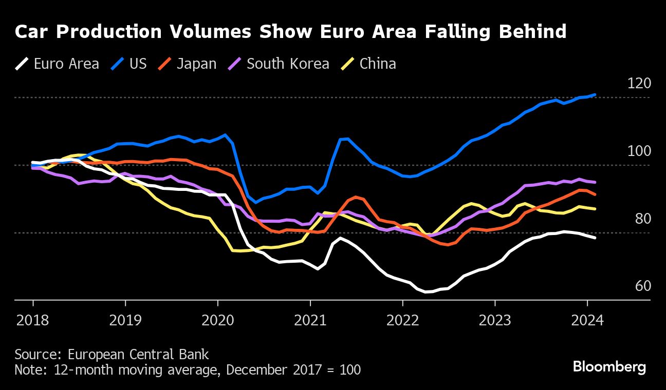 German industrial production dropped in July — highlighting the underlying troubles of Europe's largest economy after it unexpectedly shrank last quarter. Output decreased 2.4% from June, worse than all estimates in a Bloomberg survey of economists. Automotive was the main driver, though most sectors were down.