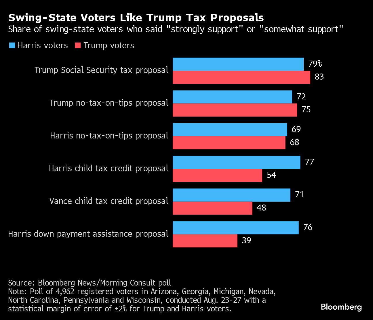 Former President Donald Trump's proposals for targeted tax breaks are resonating with battleground-state voters, who overwhelmingly approve of his ideas to eliminate taxes on tipped income and retirement benefits.