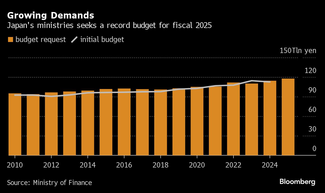 Japan's ministries have set a new record with their budget requests for the year starting April 2025, as the nation wrestles with the need to ramp up social security and defense spending while keeping its mountain of debt under control.
