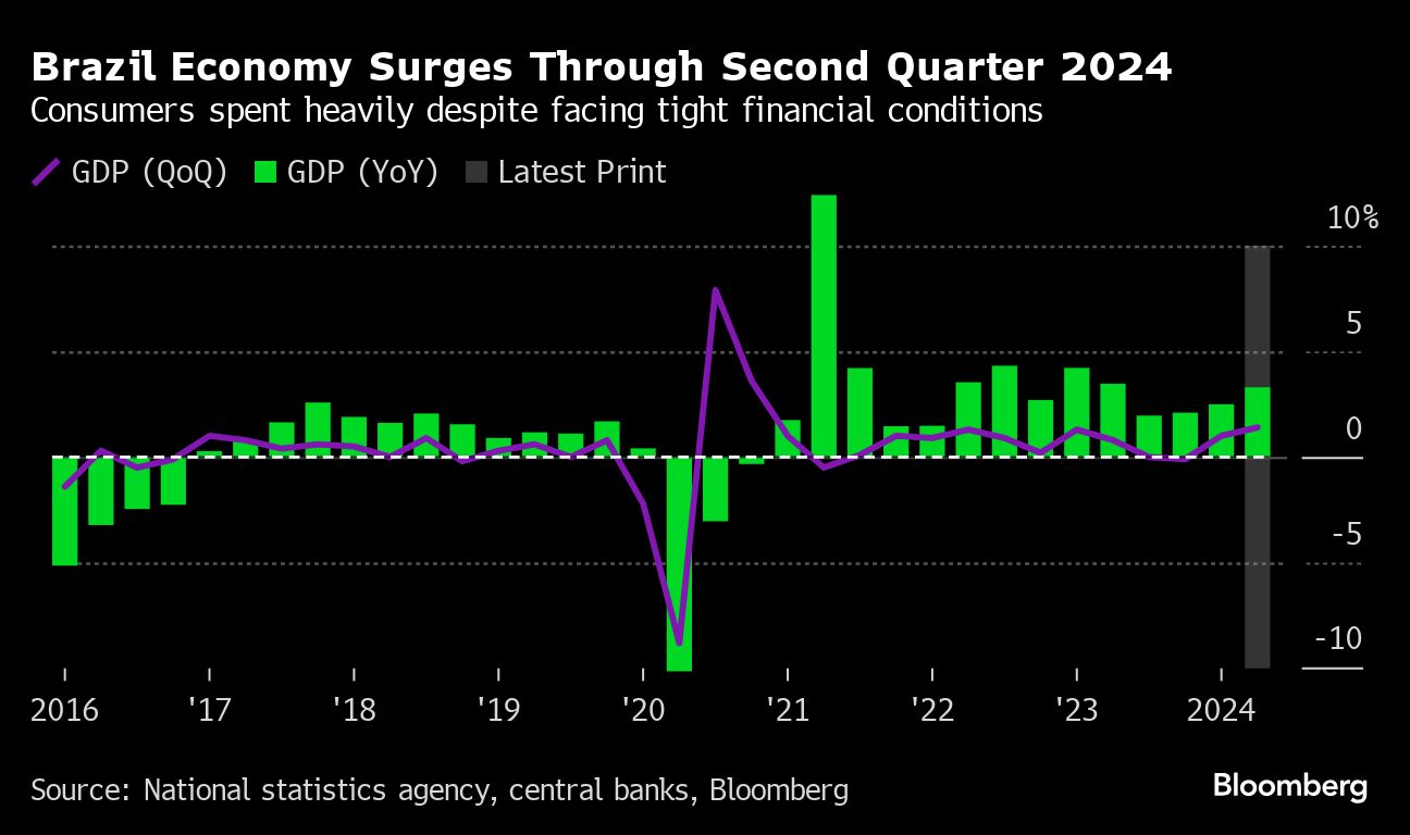 Brazil's economic growth picked up much more than expected in the second quarter, powered by strong consumer spending, raising the prospect of interest-rate hikes in the near future. Gross domestic product expanded a whopping 1.4% in the April-June period, which surpassed all forecasts in Bloomberg survey and was far more than what economists were predicting at the beginning of the period.