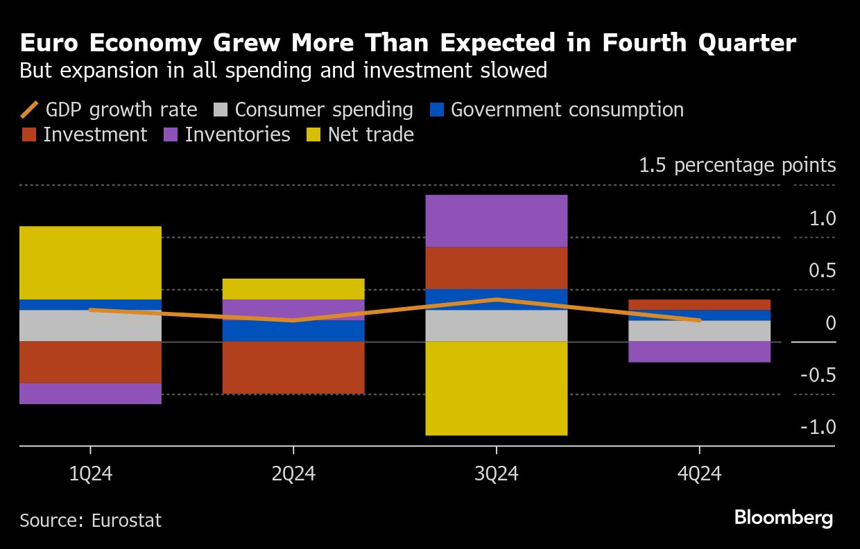 The euro-area economy grew more than initially estimated at the end of last year, bolstered by consumer spending and business investments. Fourth-quarter gross domestic product increased 0.2% from the previous three months. While twice the pace reported earlier, it represents a marked slowdown in momentum that underscores how the region is suffering from uncertainty at home and abroad.