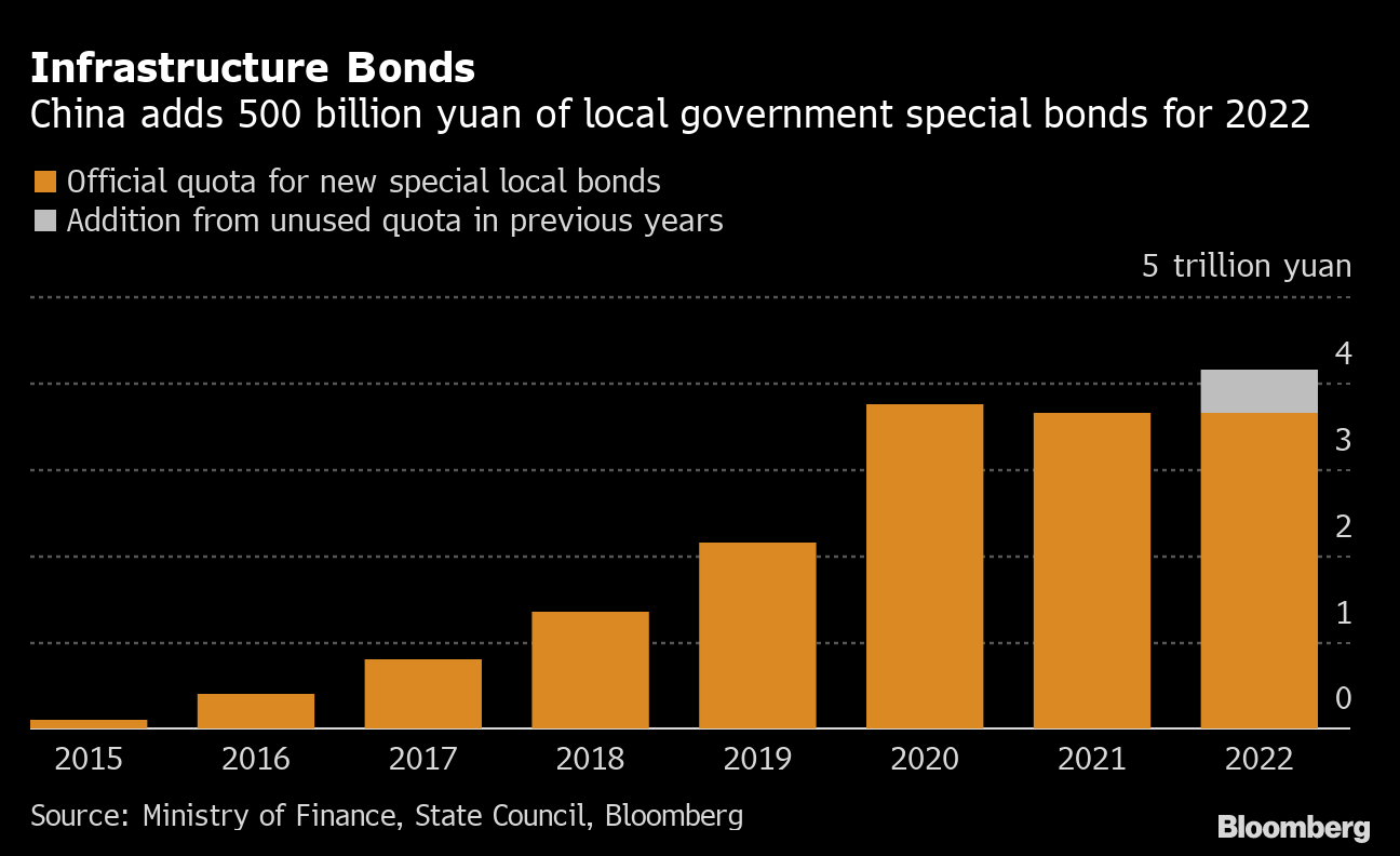(Bloomberg) -- China stepped up its economic stimulus with a further 1 trillion yuan ($146 billion) of funding largely focused on infrastructure spending, support that likely won't go far enough to counter the damage from repeated Covid lockdowns and a property market slump.