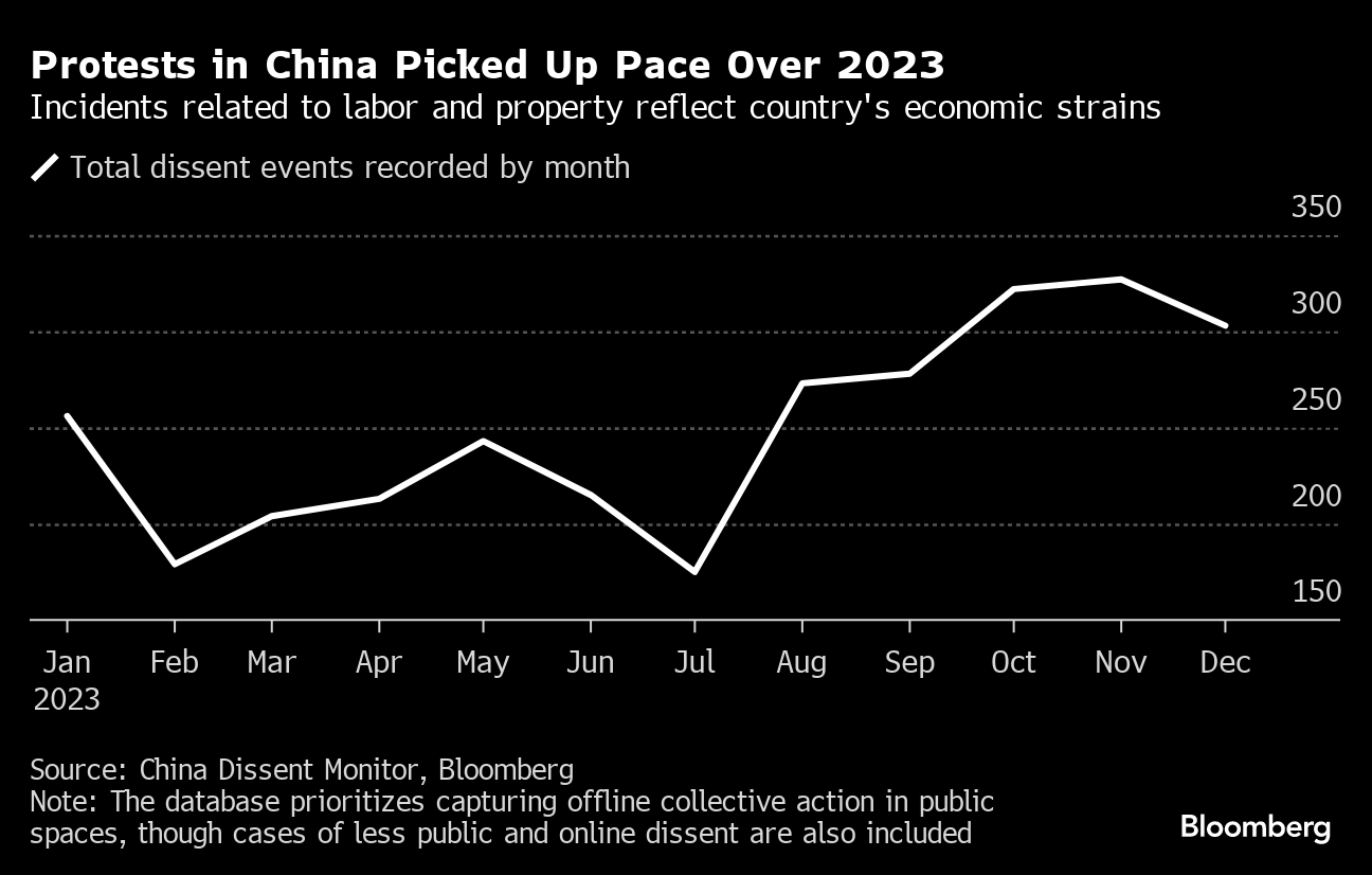 (Bloomberg) -- China experienced a rising number of protests late last year, according to a new report, adding to the worries of officials trying to engineer an economic rebound.