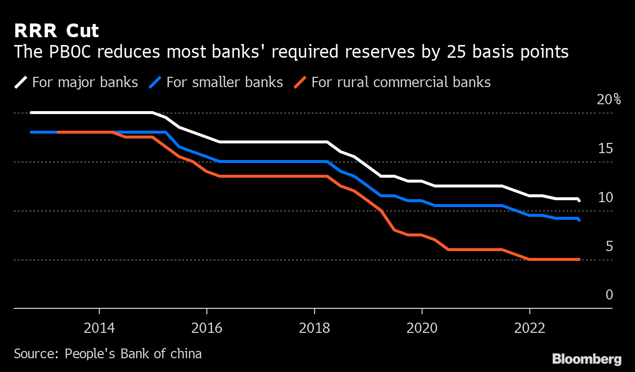 The People's Bank of China reduced the reserve requirement ratio for most banks by 25 basis points, it said in a statement Friday. The adjustment takes effect on Dec. 5 and will inject 500 billion yuan ($70 billion) of liquidity into the economy.