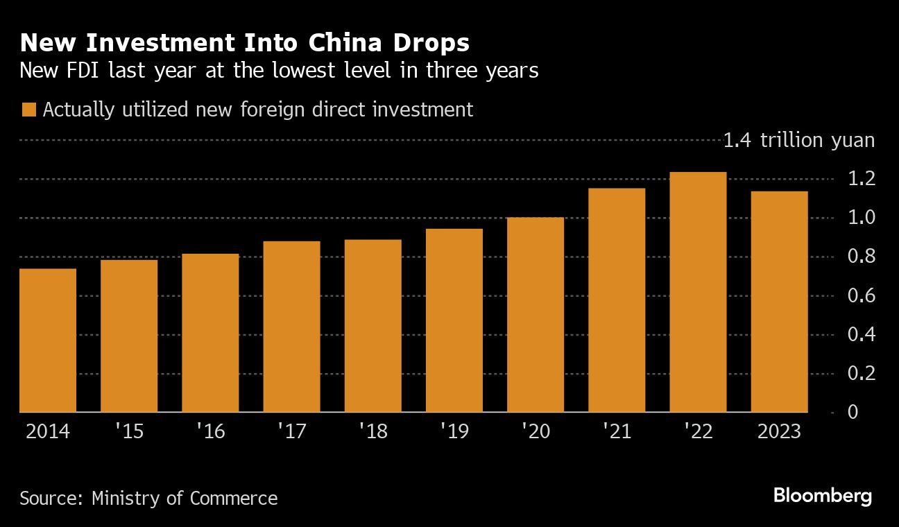 New actually utilized foreign investment fell last year to 1.1 trillion yuan ($153 billion), the lowest level since 2020 as the slowing economy, a weak post-Covid rebound and a series of investigations into overseas firms made companies less willing to invest in the mainland. That's despite the Commerce Ministry declaring 2023 the “year of investing in China.”