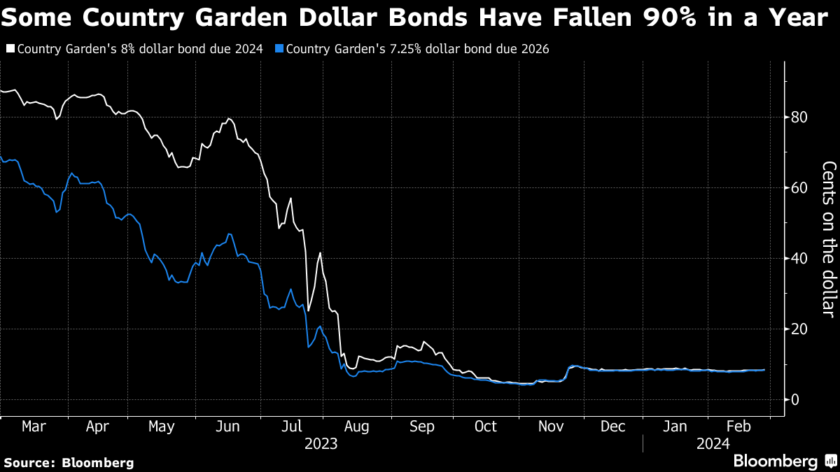 Country Garden's dollar bonds trade at deeply distressed levels of around 8 cents on the dollar, showing how little money investors expect to recover, after some were near 80 cents in June. Its shares plunged nearly 14% Wednesday, bringing the loss in the past 12 months to over 70%.