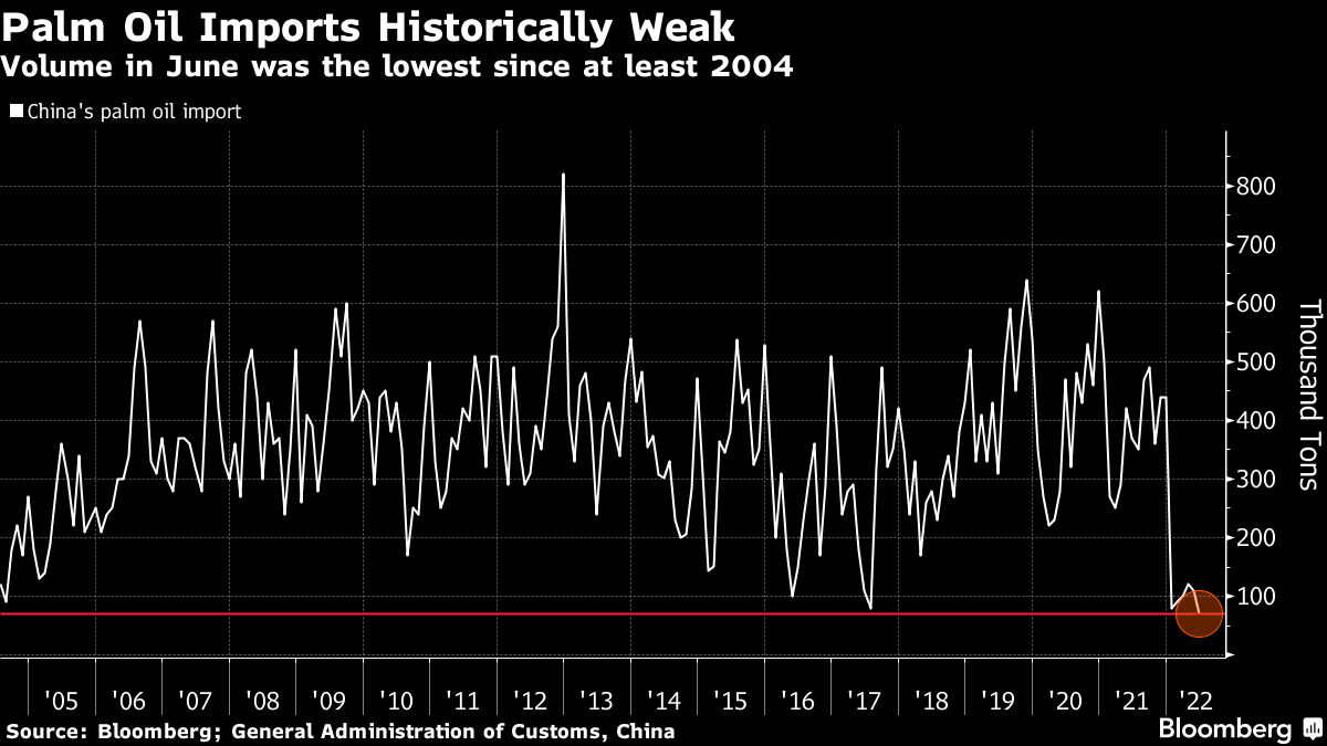 China's purchases of palm oil have already collapsed. The import volume in June of 70,000 tons was 81% lower than a year ago and the smallest haul in data going back to 2004. It also capped the weakest-ever half year for imports. Demand for the most ubiquitous of edible oils has suffered as China's virus restrictions send a chill through the restaurant and catering industries.