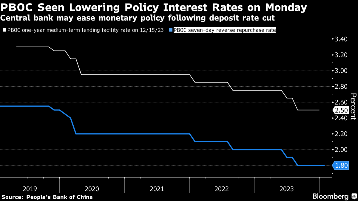(Bloomberg) -- China's central bank is likely to cut a key policy rate and pump more cash into the financial system on Monday as it tries to counter deflationary pressures and boost lending to support the economic recovery.