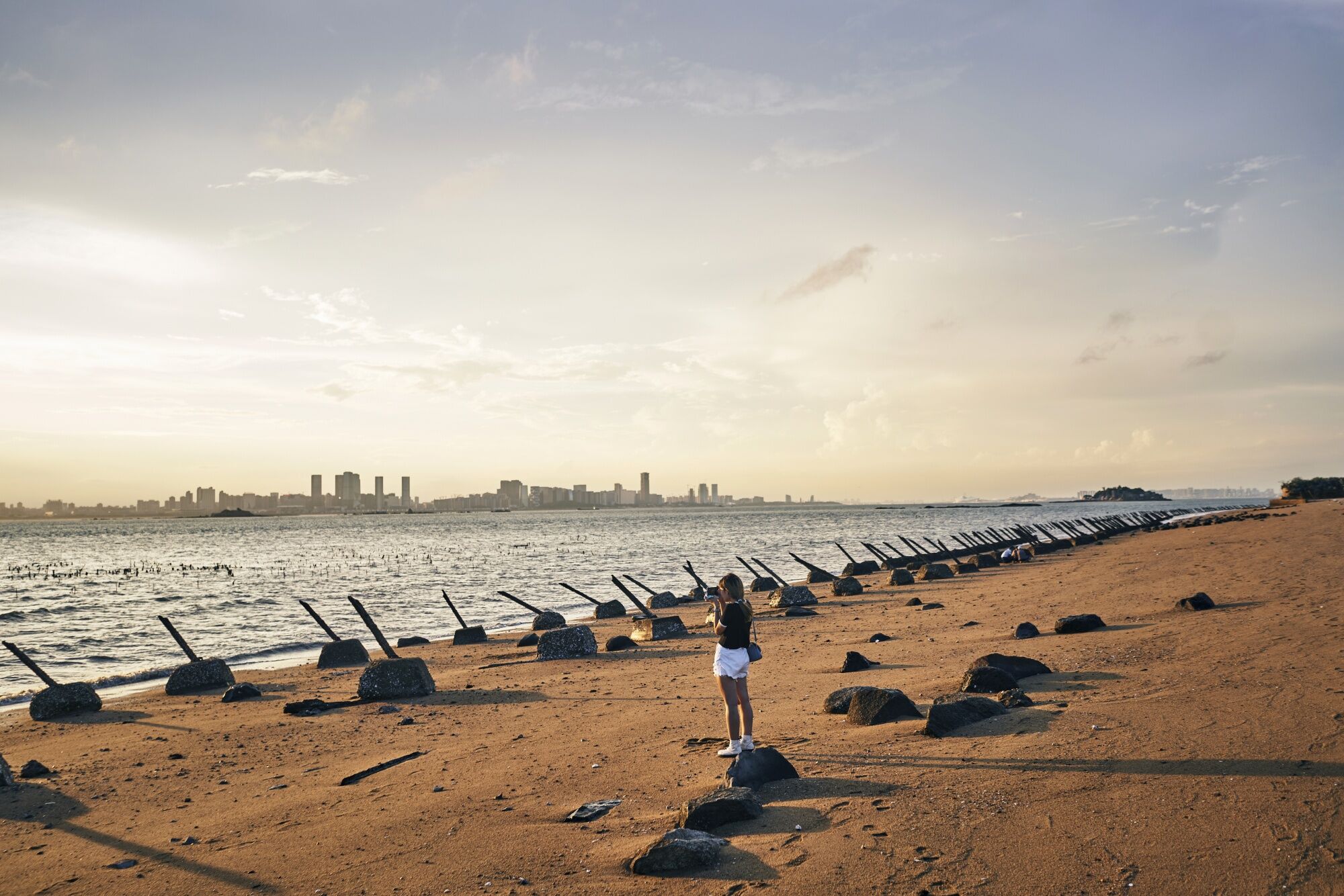 Buildings in Xiamen on mainland China stand across the Taiwan Strait from anti-landing barriers on a beach in Kinmen, Taiwan, on Monday, Aug. 21, 2023. Kinmen is located just off mainland China and was once the site of fierce fighting. Photographer: An Rong Xu/Bloomberg