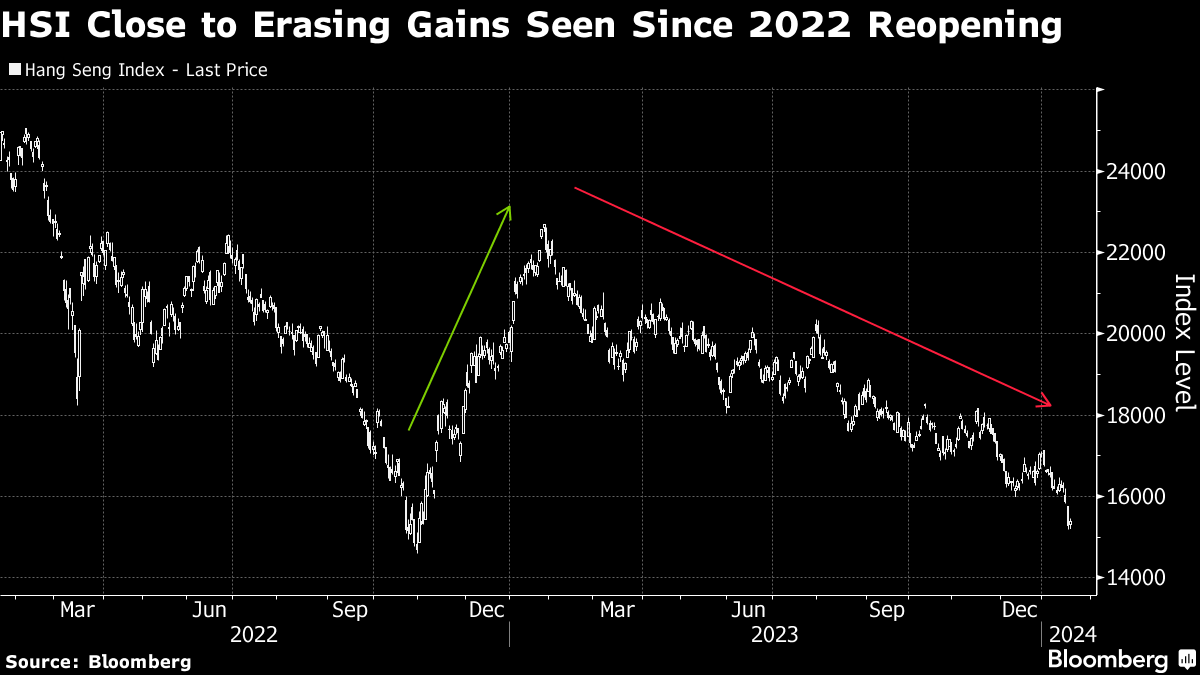 The rout in Chinese stocks deepened this year after a slew of disappointing economic data reinforced bearish sentiment. Hong Kong's Hang Seng Index has slumped nearly 10% this month, making it the worst performer among major global benchmarks.